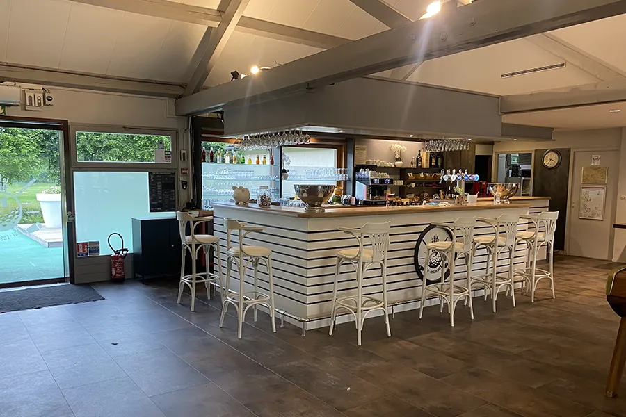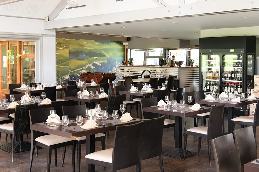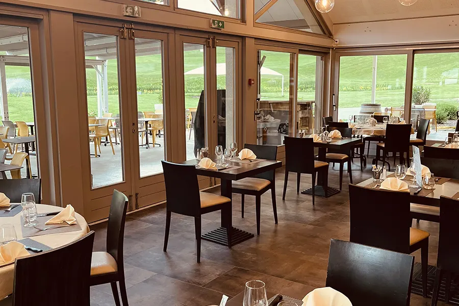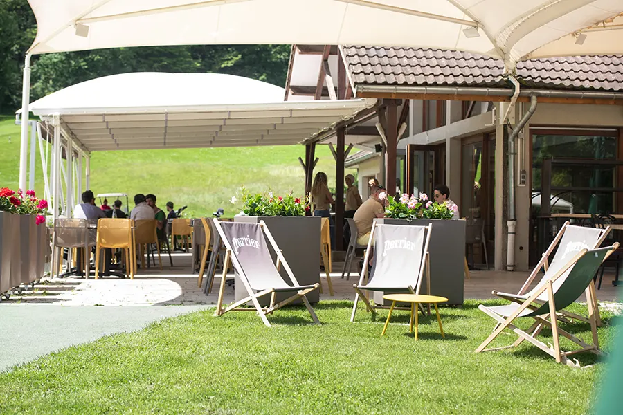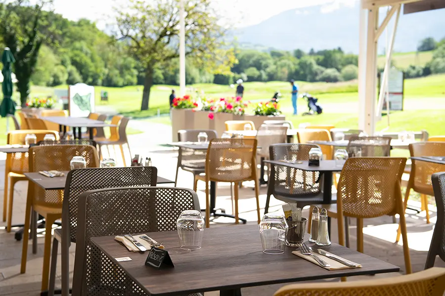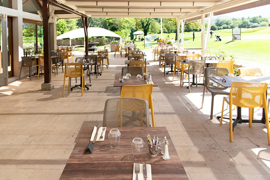 Une terrasse de 100 couverts confortable avec une vue imprenable sur le golf.